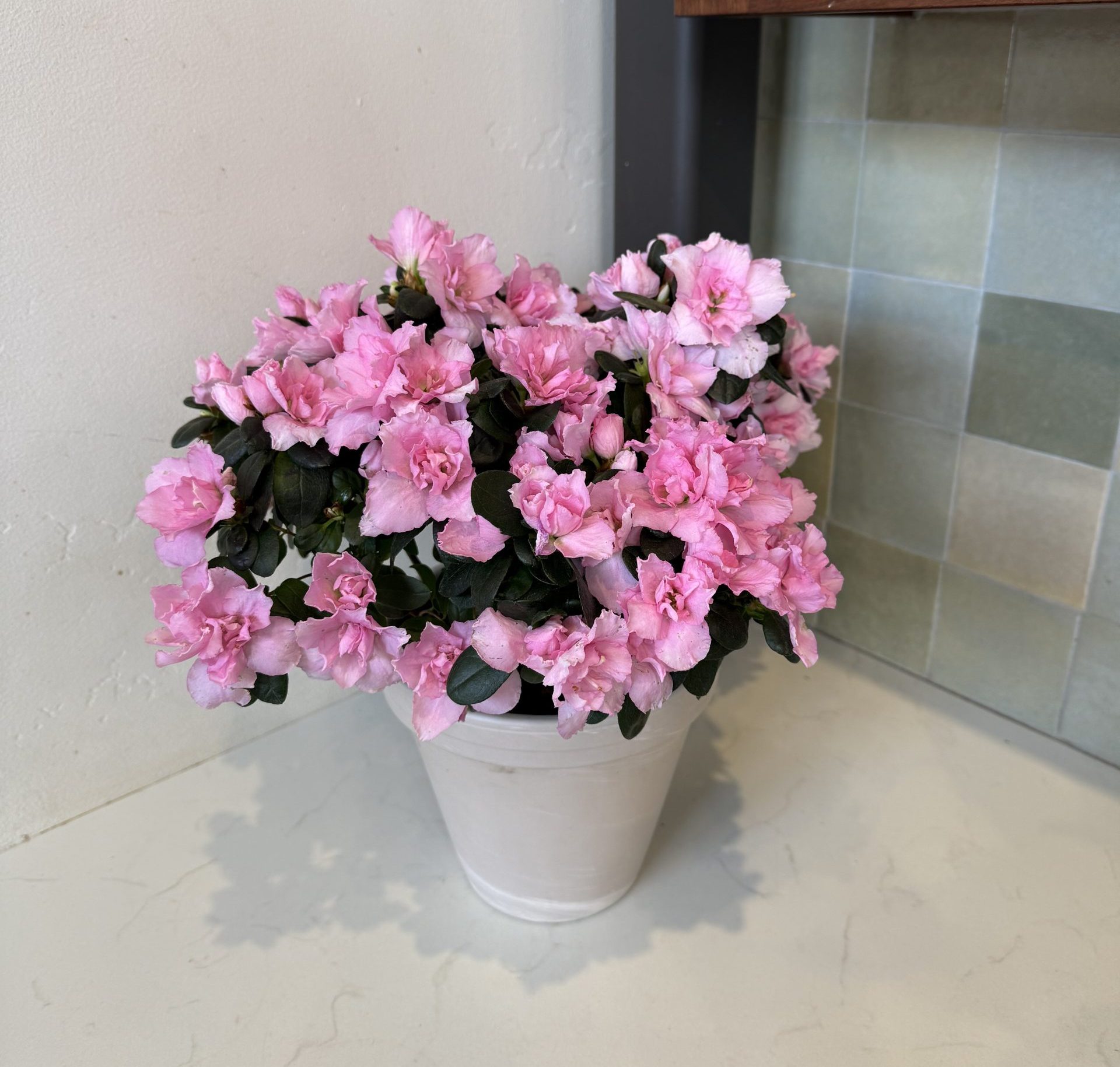 Stunning cymbidium orchid plant with at least one flowering spike in seasonal colors in pot. Please call the shop at 805-541-1417 to find out about available colors if you have a preference.