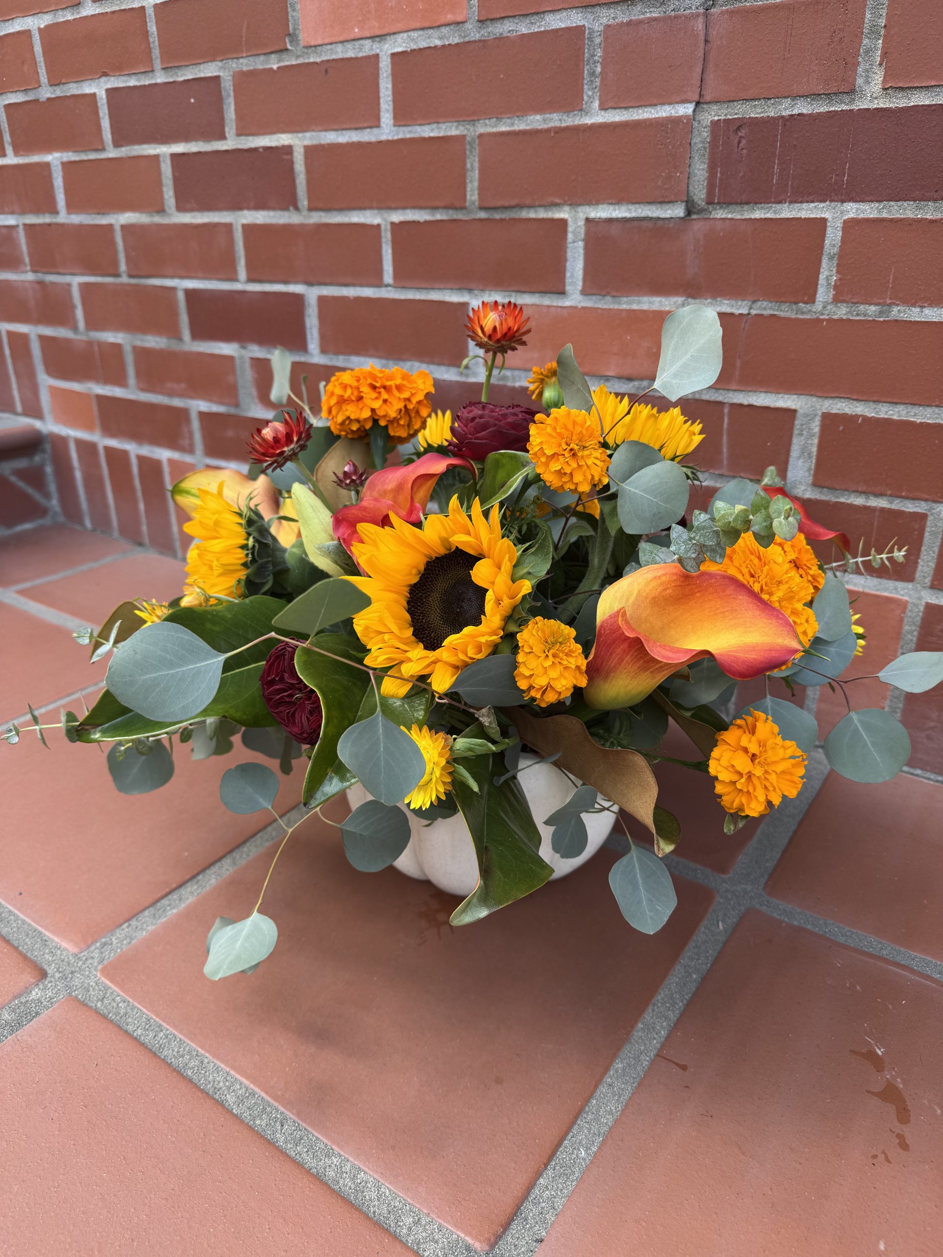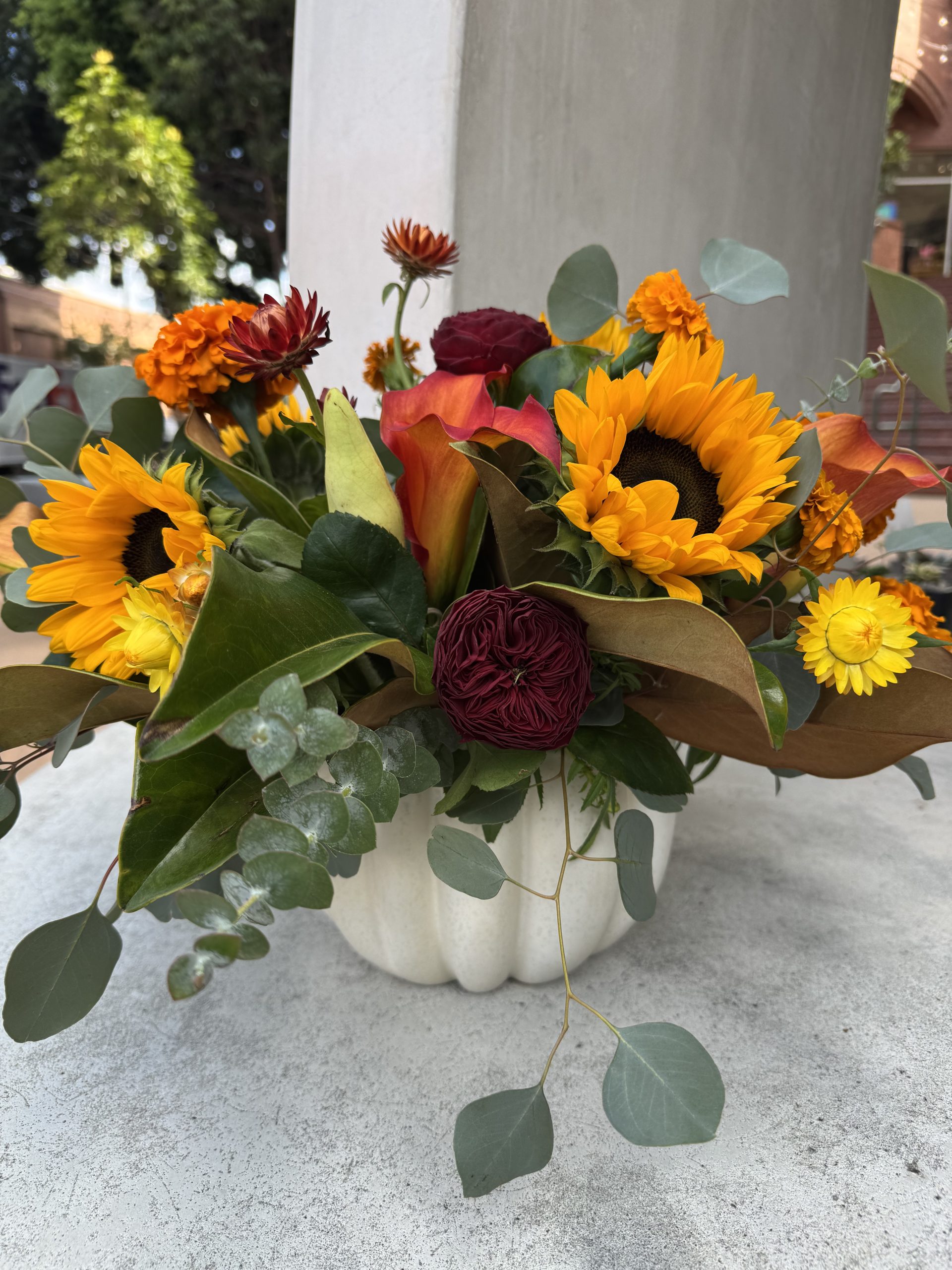 A festive centerpiece that will elevate your tablescape. Arranged in a white ceramic pumpkin container featuring seasonal garden flowers like sunflowers, calla lilies, mums, strawflowers and lush greenery.